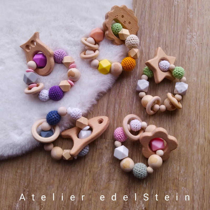 Aufgezogen auf PP Schnur mit Silikon, Häkel und Holz-Elementen.