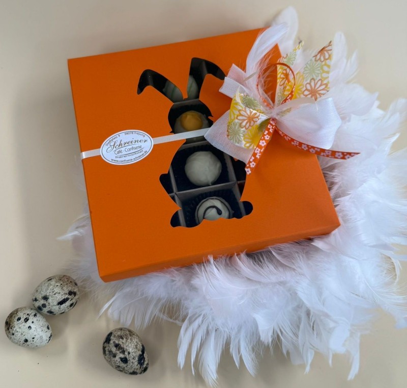 12-er Schachtel, Hasenmotiv mit Desserteier u. Pralinen aus unserer Pralinenwerkstatt