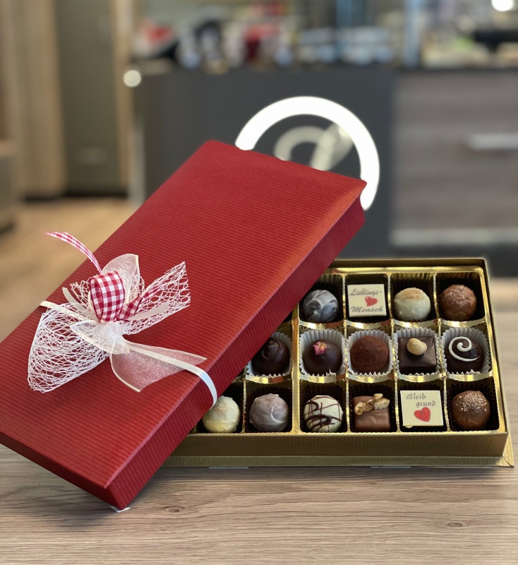 Unsere Pralinen weden durch Handarbeit gefertigt und verpackt. Wir packen auch unsere Leidenschaft zum Genuss für Sie mit ein. In der Pralinenmischung sind auch Pralinen enthalten, die je nach Saison üblich sind. Eine Praline trägt die Aufschrift "Lieblingsmensch" und eine die Aufschrift "Bleib Gsund"