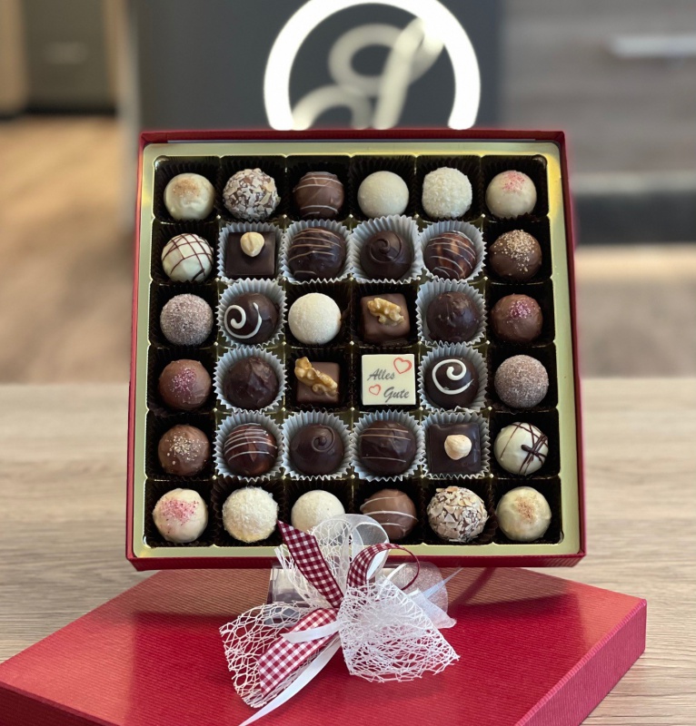 Unsere Pralinen weden durch Handarbeit gefertigt und verpackt. Wir packen auch unsere Leidenschaft zum Genuss für Sie mit ein. In der Pralinenmischung sind auch Pralinen enthalten, die je nach Saison üblich sind. Eine Praline trägt die Aufschrift "Alles Gute"