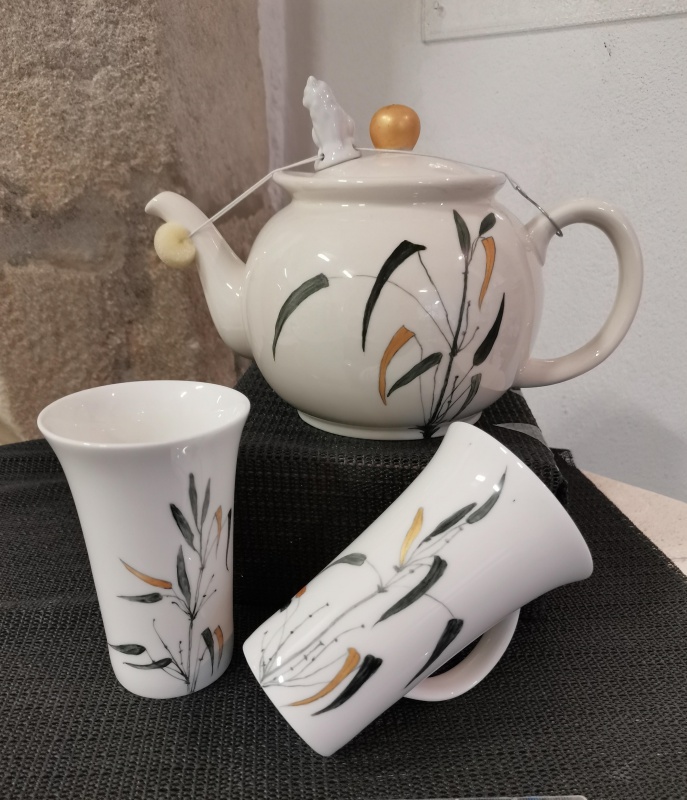 Dieses Tee- oder Kaffeeset ist sehr aufwändig mit Bambusmotiven in schwarz und gold bemalt. Es ist jederzeit erweiterbar und weitere Becher. Auch kann es nach Ihren speziellen Vorstellungen gestaltet werden. Der Preis ändert sich nur bei sehr aufwändiger Bemalung.