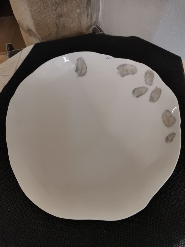 Diese ungewöhnliche Schale wurde von Roos van der Velde designed. Sie ist unregelmäßig gestaltet, diese "Unperfektion" ist jedoch durchaus gewollt. Ich habe sie mit hauchzarten Feder in Grau mit zartem Akzent in Goldfarbe gestaltet. Sie paßt ausgezeichnet zu den Platztellern (siehe ebenfalls in diesem Shop). Nicht nur als Obstschale macht sie eine gute Figur, auch ohne jeden Inhalt ist sie ein absoluter Hingucker in der Wohnung.