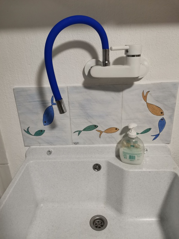 Fliesenschild für das Waschbecken, für die Rückwand in der Küche, als besondere Gestaltung im Bad (z.B. in der Dusche, über der Wanne). Auch sehr gut geeignet, um Reparaturen zu kaschieren. Kann auch auf Ihren eigenen Bad- oder Küchenfliesen (bevor sie eingebaut werden!) und mit Dekor ganz nach Ihren Wünschen gestaltet werden. Der Preis richtet sich nach Umfang und Größe des Fliesenschildes. Am besten wir besprechen das per Telefon ganz individuell. Dieses Beispiel besteht aus 3 Fliesen, ca 20x25 cm und kostet komplett 60,-- Euro.