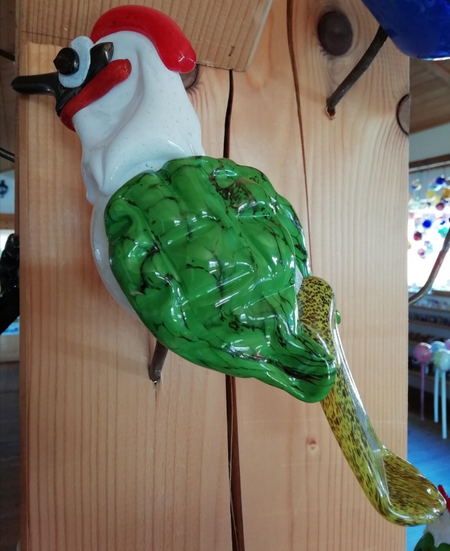 Der Grünspecht ist aus verschiedenfarbigen und massiven Glas gestaltet. Hat ein 20mm großes Loch, damit man ihn mit Hilfe von einem Nagel an einem Baum oder Balken befestigen kann. Größe ca. 24cm.