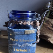 Drahtbügelglas "Schoki" mit Jeans-Deko