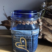 Drahtbügelglas "Glück" mit Jeans-Deko