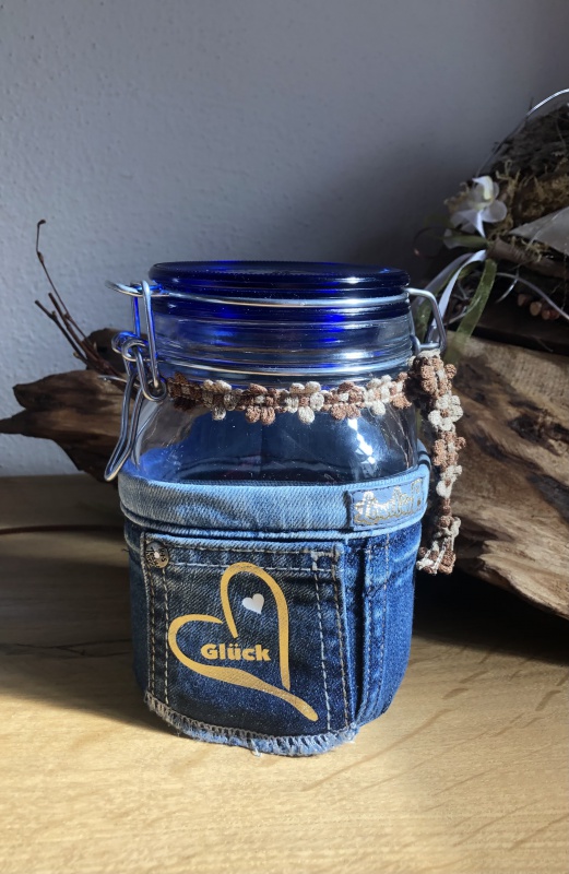Drahtbügelglas "Glück" mit Jeans-Deko