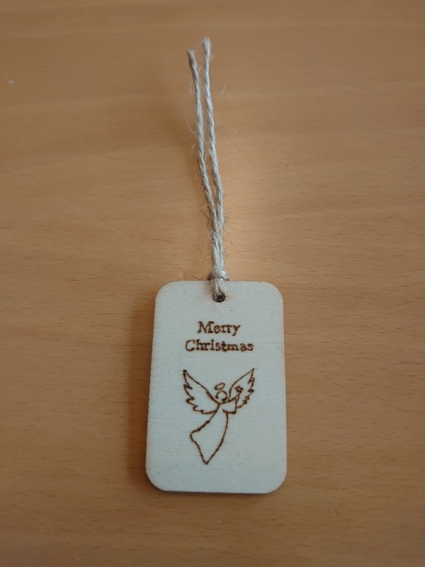 Selbstgemachter Geschenkanhänger aus Holz mit Holzbrand. Größe: ca. 5 cm x 3,5 cm