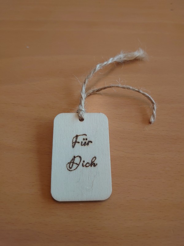 Selbstgemachter Geschenkanhänger aus Holz mit Holzbrand. Größe: ca. 5 cm x 3,5 cm