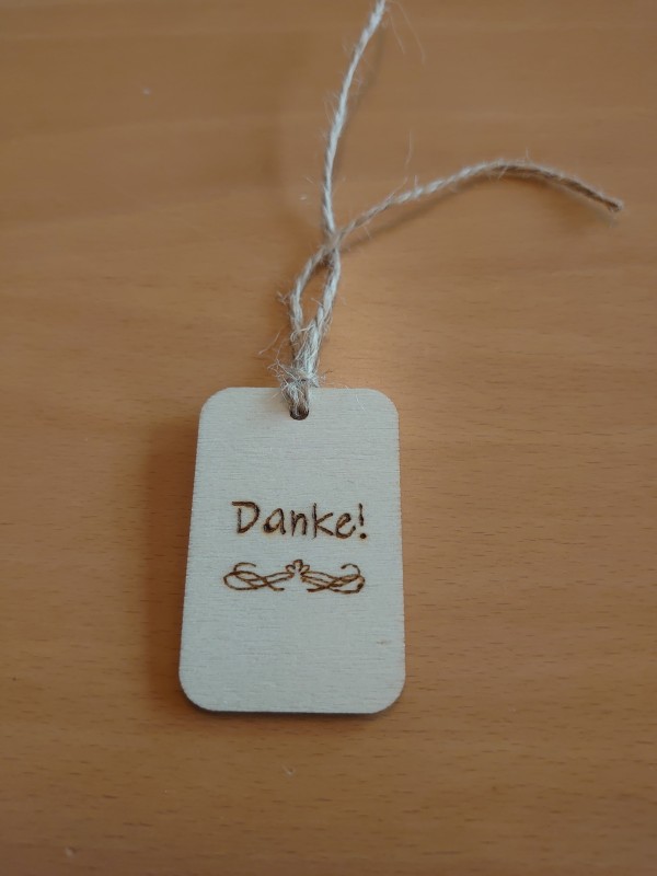 Selbstgemachter Geschenkanhänger aus Holz mit Holzbrand. Größe: ca. 5 cm x 3,5 cm
