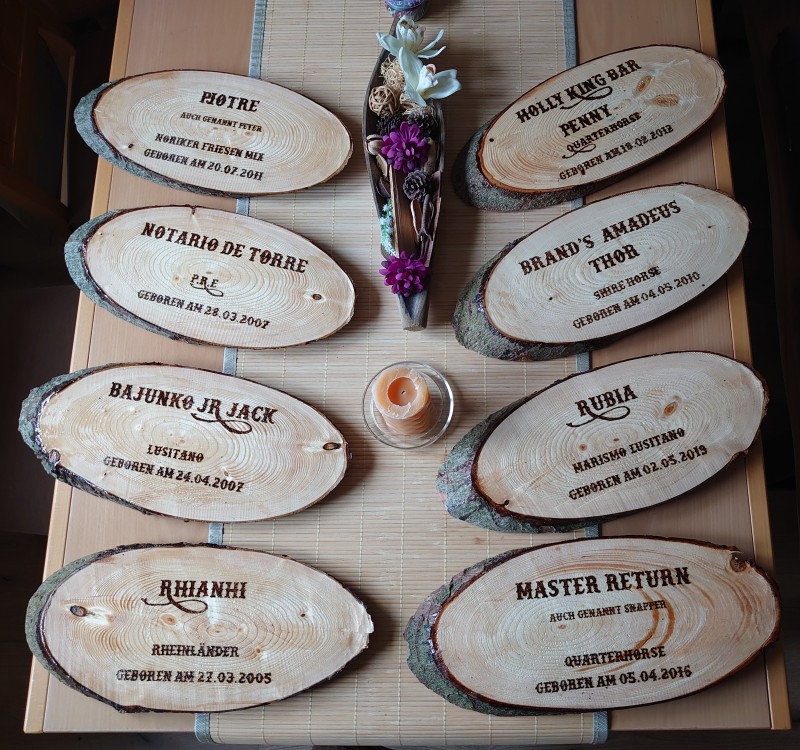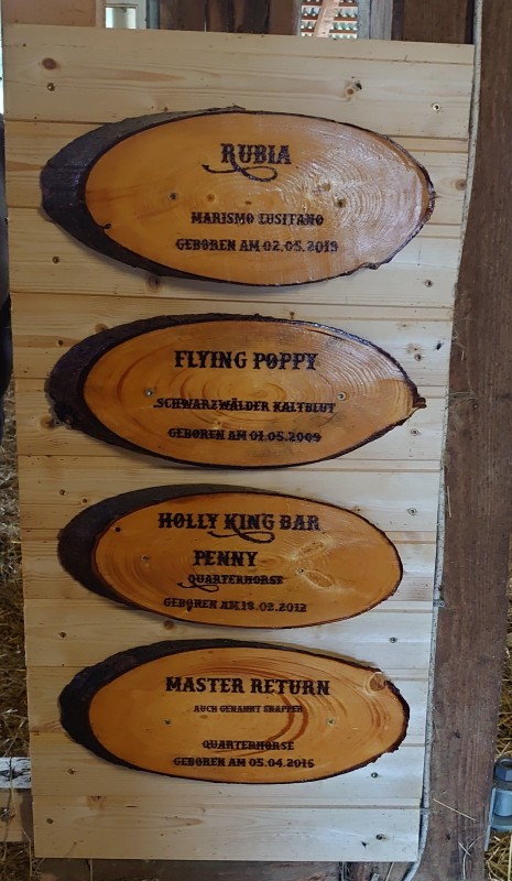 Auf Wunsch individuell gestaltete Holzschilder für die Box eines Pferdes oder Offenstall, auf dem mit Holzbrand die Details zum Pferd eingebrannt werden. Die Größe und Form ist frei wählbar, genauso die Schriftart, Schriftgröße und die Details zum Pferd. Zudem wird das Schild mit Bootslack lackiert, um der Witterung im Stall standzuhalten. Bei den Beispielfotos wurde eine ovale Holzscheibe mit Rinde verwendet mit einer Länge von ca. 40cm.