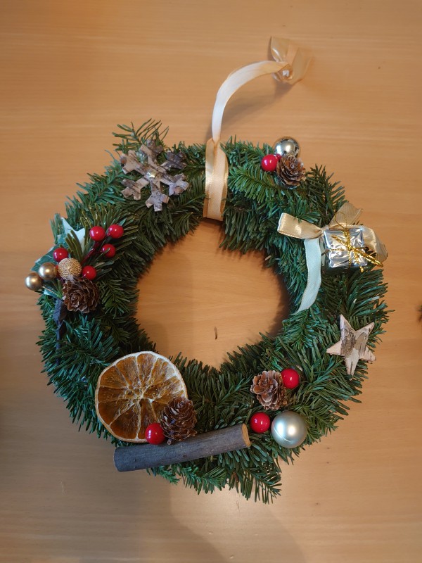 Selbstgebastelter weihnachtlicher Türkranz. Türkranz mit echten Zweigen und verschiedenen Dekoelementen. Durchmesser ca. 21 cm.