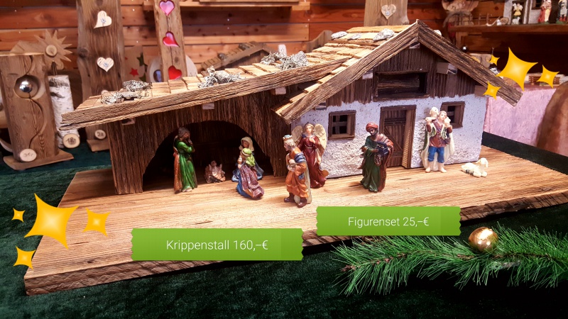 Der Stall ist reine Handarbeit mit unbehandelten Altholz verkleidet. LED Beleuchtung ist inklusive. Der Stall kann für 160,-€ und das Figuren Set auch extra für 25,-€ gekauft werden. Kompl. Stall und dieses Figuren Set 180,-€.