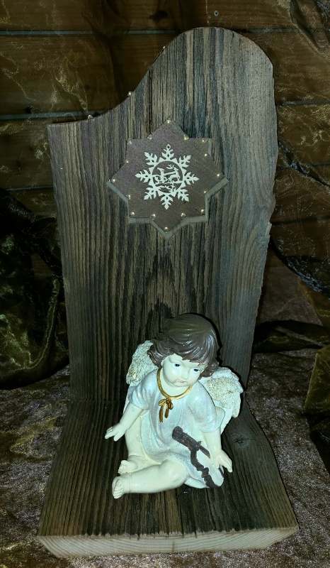 Dekoratives Alt Holz mit niedlichen sitzenden Engel. LED Beleuchtung inkl. Batterie.