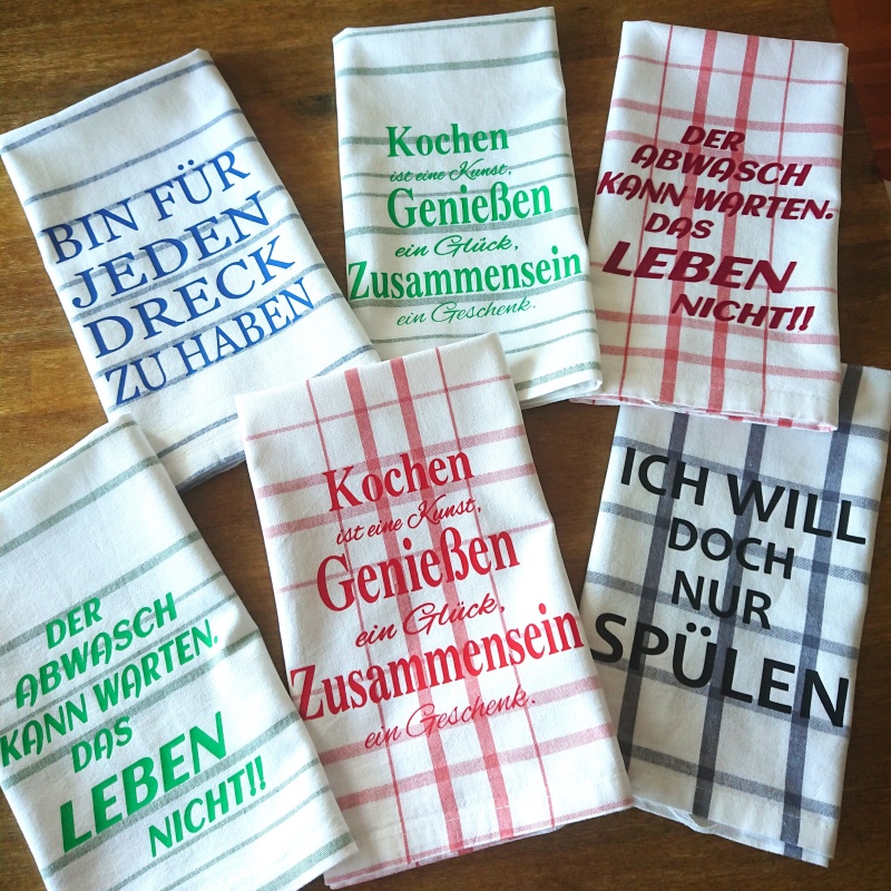 Aufdruck und Geschirrtücher sind in verschiedenen Farben erhältlich, bitte bei der Bestellung einfach Farbwunsch und Spruch angeben.