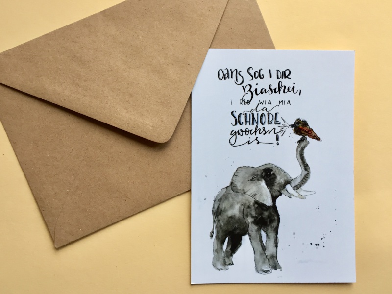 Postkarte „oans sog o dir Biaschei, i red so wia mia da Schnobe gwochsn is“