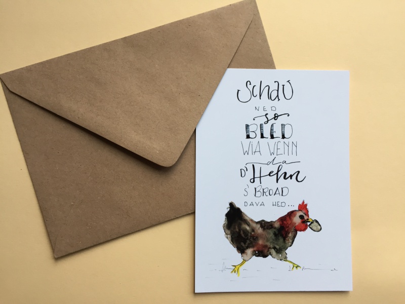 Postkarte „schau ned so bled, wia wenn da d‘Hehn s Broad dass hed“